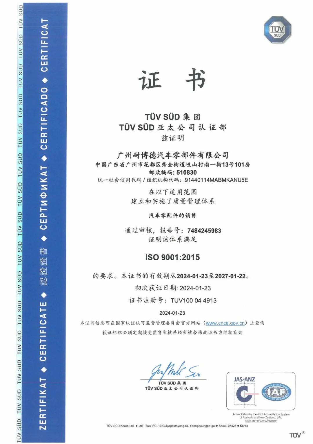 【喜讯】耐博德荣获ISO 9001质量管理体系认证!1月23日,广州耐博德汽车零部件有限公司通过了TUV SUD集团TUV SUD亚太公司认证部认证,获得ISO 9001认证证书。 ○ 关于ISO 9001 ○ ISO 9001质量管理体系是基于企业或团体内部流程规范建设的一个指导标准。