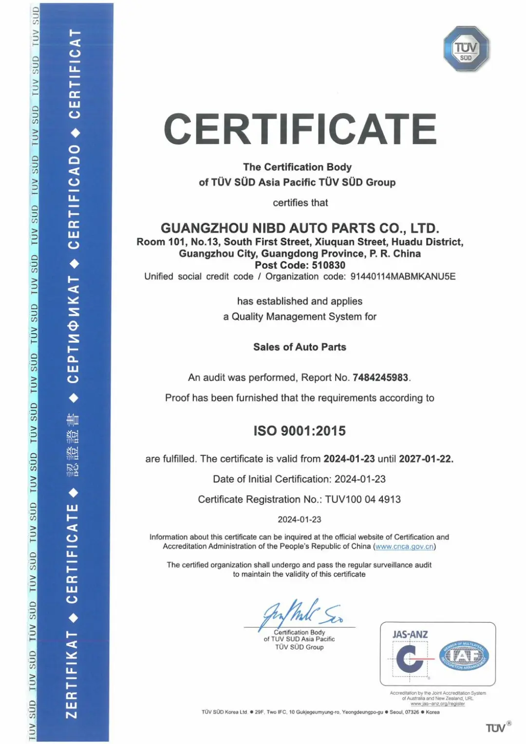 它是从产品质量认证中演变出来的,后期发展到各个行业与领域,是全球应用最广泛的体系标准,也是迄今为止世界上最成熟的质量框架,全球有161个国家/地区的超过75万家组织正在使用这一框架。ISO 9001认证是ISO 9000族标准所包括的一组质量管理体系核心标准之一。 ○ 荣获证书 ○ ISO 9001质量管理体系认证证书的获得表明,作为一家专业的汽车零配件销售商,耐博德不但具备有效的质量管理体系,也是公司对各项管理工作的规范化、标准化的全面检测,是对公司持续稳定健康发展的重要保证。